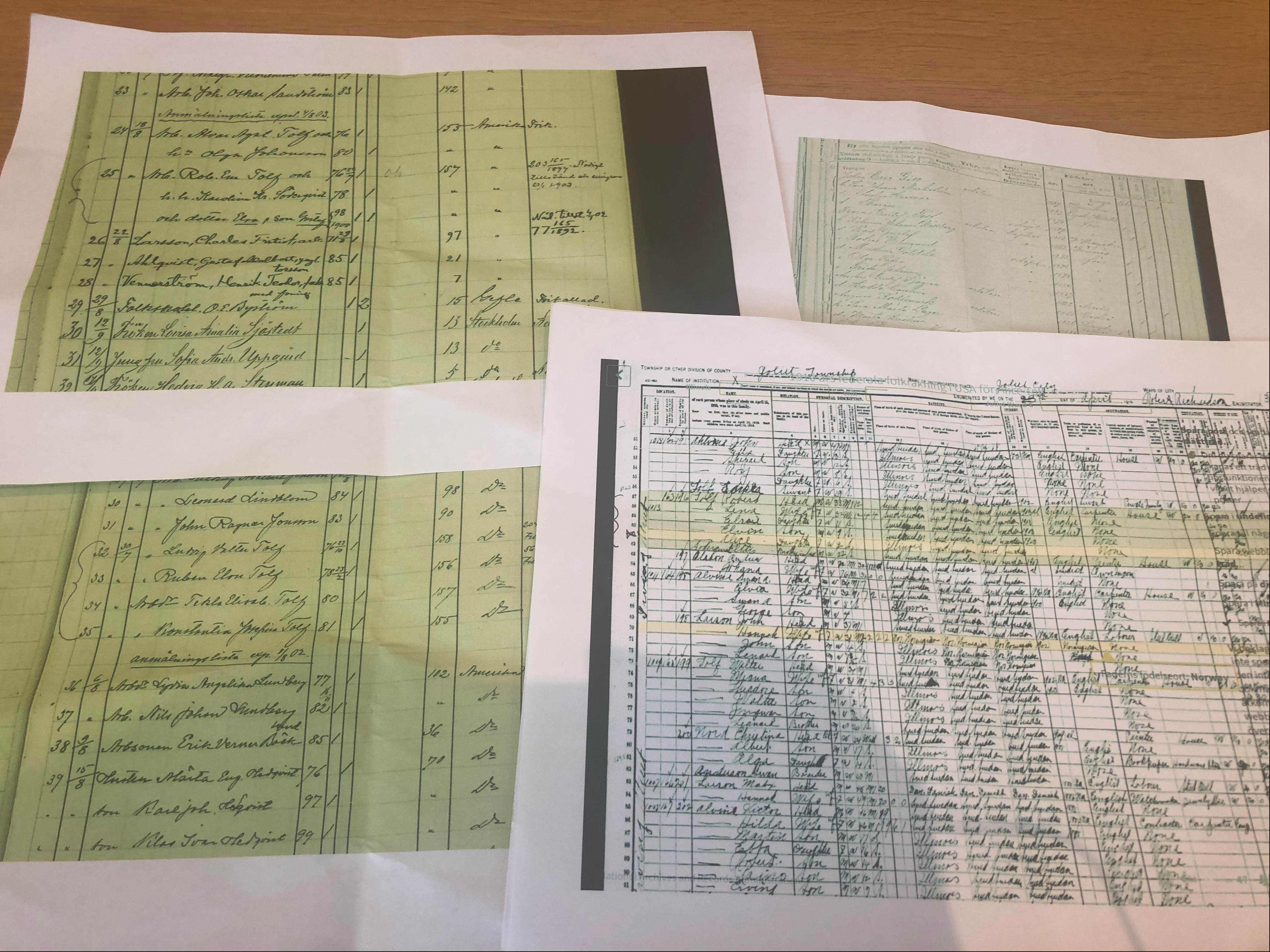 Documents with records of my family, including a list of people leaving Sundsvall and the 1910 US Census