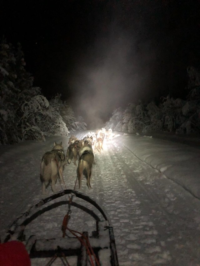 - Dog Sledding: We went dog sledding our first night, and it was wonderful! The doggos were super sweet and excited to be doing the run that night. It was so cold that my bangs froze during the few hours we were out.